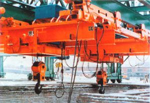 本产品为双梁悬挂起重机,是一套组合设备。它由12.5吨电动葫芦小车、电动双梁悬挂过轨起重机(大车运行电动)、电动双梁悬挂过轨起重机(大车运行手动)和过轨装置组成。整套设备由一个统一的电气系统和一个按钮开关操纵和控制。